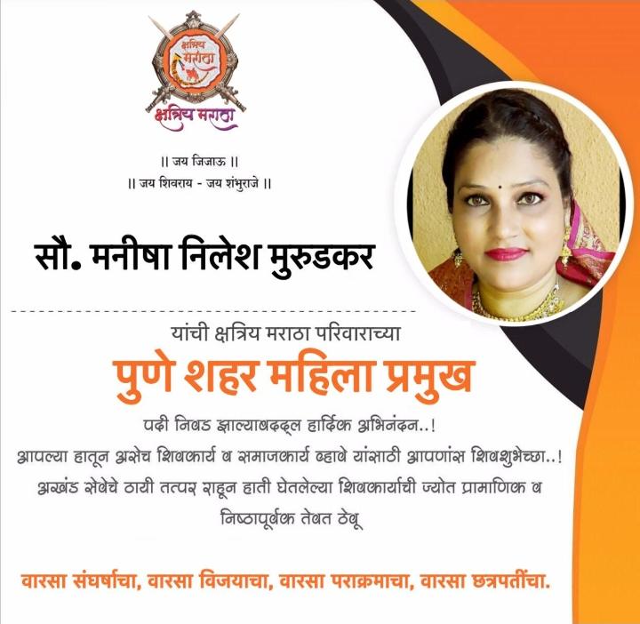 सौ.मनीषा निलेश मुरुडकर यांचि क्षत्रिय मराठा परिवार पुणे शहर महिला प्रमुख पदि निवड झाल्या बद्दल हार्दिक अभिनंदन